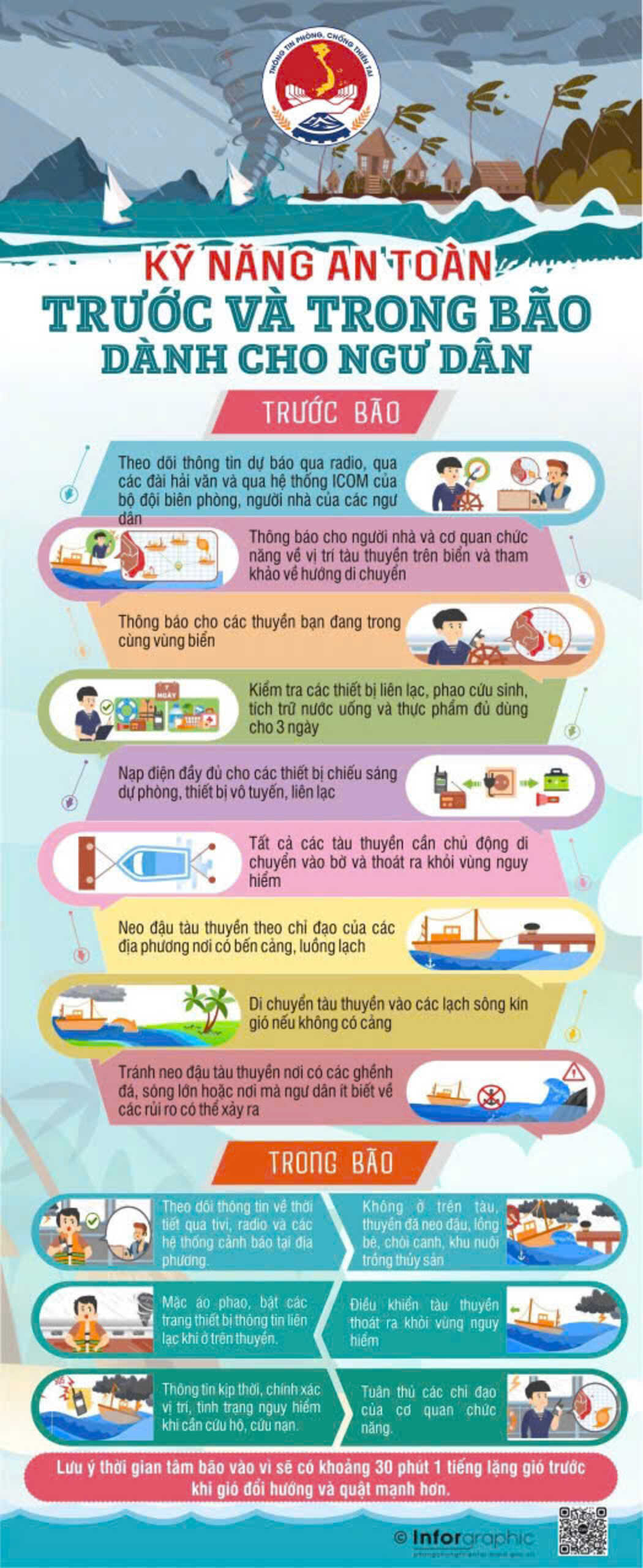 22/07/2025 | lượt xem: 90 Hướng dẫn kỹ năng ứng phó với bão số 3 và mưa lũ sau bão Ngày 20/7, Cục Quản lý đê điều và Phòng, chống thiên tai ra thông báo về Hướng dẫn kỹ năng ứng phó với bão số 3 và mưa lũ sau bão. Hồi 10h ngày 20/7, tâm bão ở khoảng 21,8°N; 114,2°E, trên vùng biển phía Bắc khu vực Bắc Biển Đông, cách Quảng Ninh–Hải Phòng khoảng 680km về phía Đông. Sức gió mạnh nhất vùng gần tâm bão cấp 11–12, giật cấp 15. Bão di chuyển theo hướng Tây với tốc độ 20–25km/h. Dự báo: Bão sẽ tiếp tục di chuyển theo hướng Tây, sau chuyển Tây Tây Nam với tốc độ 20–25km/h. 10h ngày 21/7: trên vùng biển phía Đông khu vực Bắc vịnh Bắc Bộ, cấp 11, giật cấp 14. 10h ngày 22/7: ven biển Quảng Ninh – Thanh Hóa, cấp 10–11, giật cấp 14. Cảnh báo mưa lớn: Từ 21–23/7: Đông Bắc, đồng bằng Bắc Bộ, Thanh Hóa, Nghệ An mưa rất to từ 200 đến 350mm, cục bộ có nơi lớn hơn 600mm. Các nơi khác ở Bắc Bộ, Hà Tĩnh mưa từ 100 đến 200mm, cục bộ lớn hơn 300mm. Mưa lớn có khả năng gây ra tình trạng ngập úng tại các vùng trũng, thấp; lũ quét trên các sông, suối nhỏ, sạt lở đất trên sườn dốc. Hướng dẫn kỹ năng ứng phó với bão số 3 và mưa lũ sau bão Để đảm bảo an toàn tính mạng và tài sản trước bão và mưa lũ sau bão, người dân lưu ý không nên chủ quan, tuân thủ theo các khuyến cáo sau: 1. Theo dõi dự báo, cảnh báo, cập nhật diễn biến của bão để chủ động phòng, tránh. 2. Đảm bảo an toàn tàu thuyền nơi neo đậu, bảo vệ lồng, bè thủy sản, nhất là người dân trên các đảo; tuyệt đối không ở lại trên tàu thuyền đã neo đậu, tàu du lịch, chòi canh, lồng bè, khu nuôi trồng thủy sản khi bão đổ bộ; 3. Đảm bảo an toàn khi đi du lịch mùa mưa bão: thường xuyên theo dõi diễn biến thời tiết, cảnh báo thiên tai, chủ động hoãn hoặc hủy các chuyến đi khi thời tiết xấu để đảm bảo an toàn; tránh di chuyển đến khu vực ven biển, đảo, vùng núi hoặc nơi có nguy cơ sạt lở và lũ quét. Tuyệt đối không ra ngoài khi bão đang đổ bộ, trừ trường hợp khẩn cấp và có hướng dẫn cụ thể từ lực lượng chức năng. 4. Xác định vị trí trú ẩn an toàn nhất cho tất cả thành viên trong gia đình; chủ động sơ tán khi cần thiết hoặc theo yêu cầu của chính quyền địa phương. 5. Chủ động dự trữ thực phẩm, nước uống, thuốc men, vật dụng cần thiết đủ dùng. 6. Gia cố, chẳng chống nhà cửa; cắt tỉa cành cây; tháo dỡ biển quảng cáo, áp phích có nguy cơ mất an toàn; đảm bảo an toàn công trình đang thi công. 7. Gia cố chuồng trại gia súc, gia cầm; tranh thủ thu hoạch sớm các sản phẩm nông nghiệp, thủy sản theo phương châm “xanh nhà hơn già đồng” 8. Đề phòng mưa, lũ, ngập lụt tại một số vùng trũng thấp, khu vực đô thị và lũ quét, sạt lở đất ở miền núi; đề phòng nước dâng vùng ven biển, cửa sông. 9. Kê cao tài sản, cất giữ giấy tờ quan trọng ở nơi an toàn, di chuyển phương tiện cơ giới đến nơi có địa hình cao. 10. Chủ động khơi thông cống thoát nước gần nhà, khu dân cư mình ở tạo đường thoát lũ; thông báo tới chính quyền khi có sự cố về tắc nghẽn cống thoát nước, các điểm ngập sâu; không đỗ xe ở các vùng có nguy cơ ngập; đề phòng ngập tầng hầm chung cư. 11. Lưu các số điện thoại cứu hộ, cứu nạn để sử dụng trong trường hợp khẩn cấp. Cục Quản lý đê điều và Phòng, chống thiên tai Cục quản lý đê điều và phòng chống thiên tai